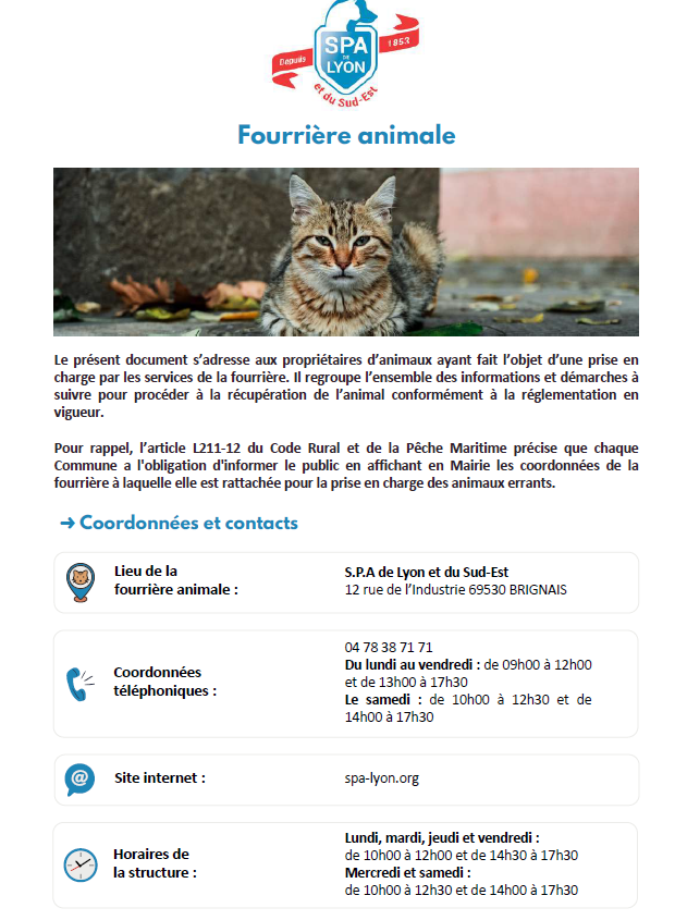 La commune vient de souscrire une convention de fourrière animale pour les années 2026-2027 avec la SPA de Lyon. Lorsque Les habitants remarques un animal errant, ils peuvent le signaler [...]