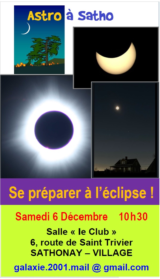 🌒 CONFÉRENCE – GALAXIE 2001 📅 Samedi 6 décembre – 10h30 📍 Le Club – 6 route de Saint-Trivier – Sathonay-Village ✨ 12 AOÛT 2026 : PHÉNOMÈNE EXCEPTIONNEL ! [...]