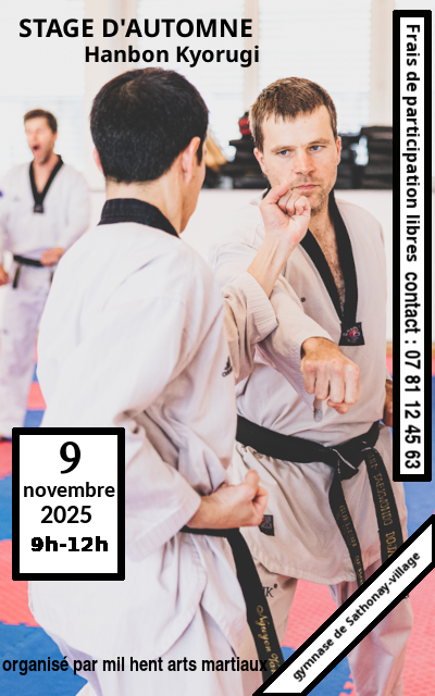 ARTS MARTIAUX - STAGE D'AUTOMNELe Club Mil Hent Arts Martiaux vous propose un stage : Le 09 Novembre 2025De 9h à 12hContact : 07 81 12 45 63